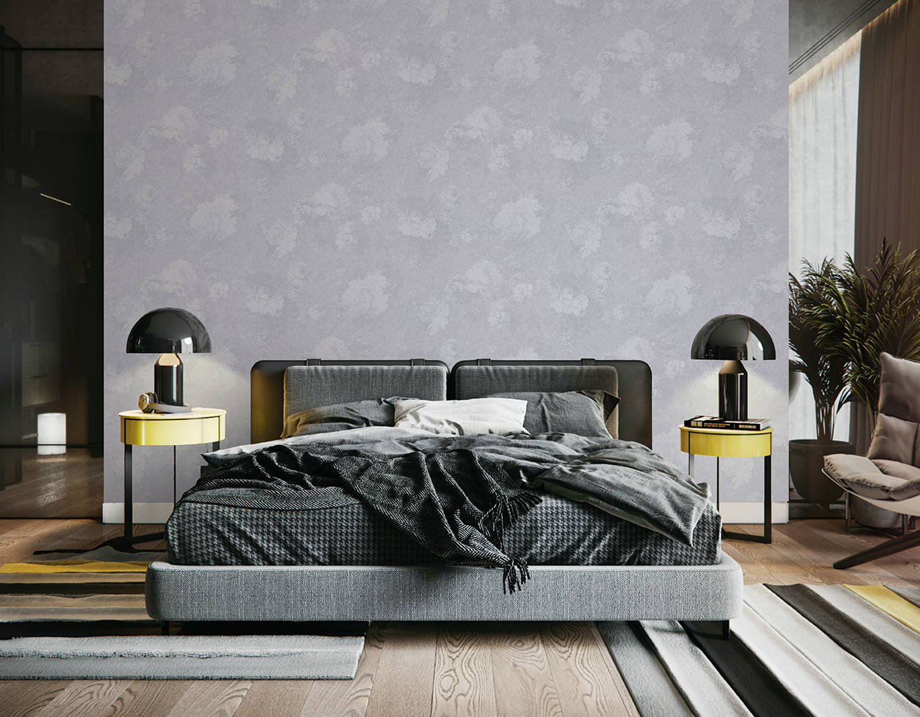 现代轻奢风适配:适配冷调极简轻奢 —— 深灰床品 + 亮黄边几,墙布的暗花让极简空间不 “寡淡”,反而多了精致细节。