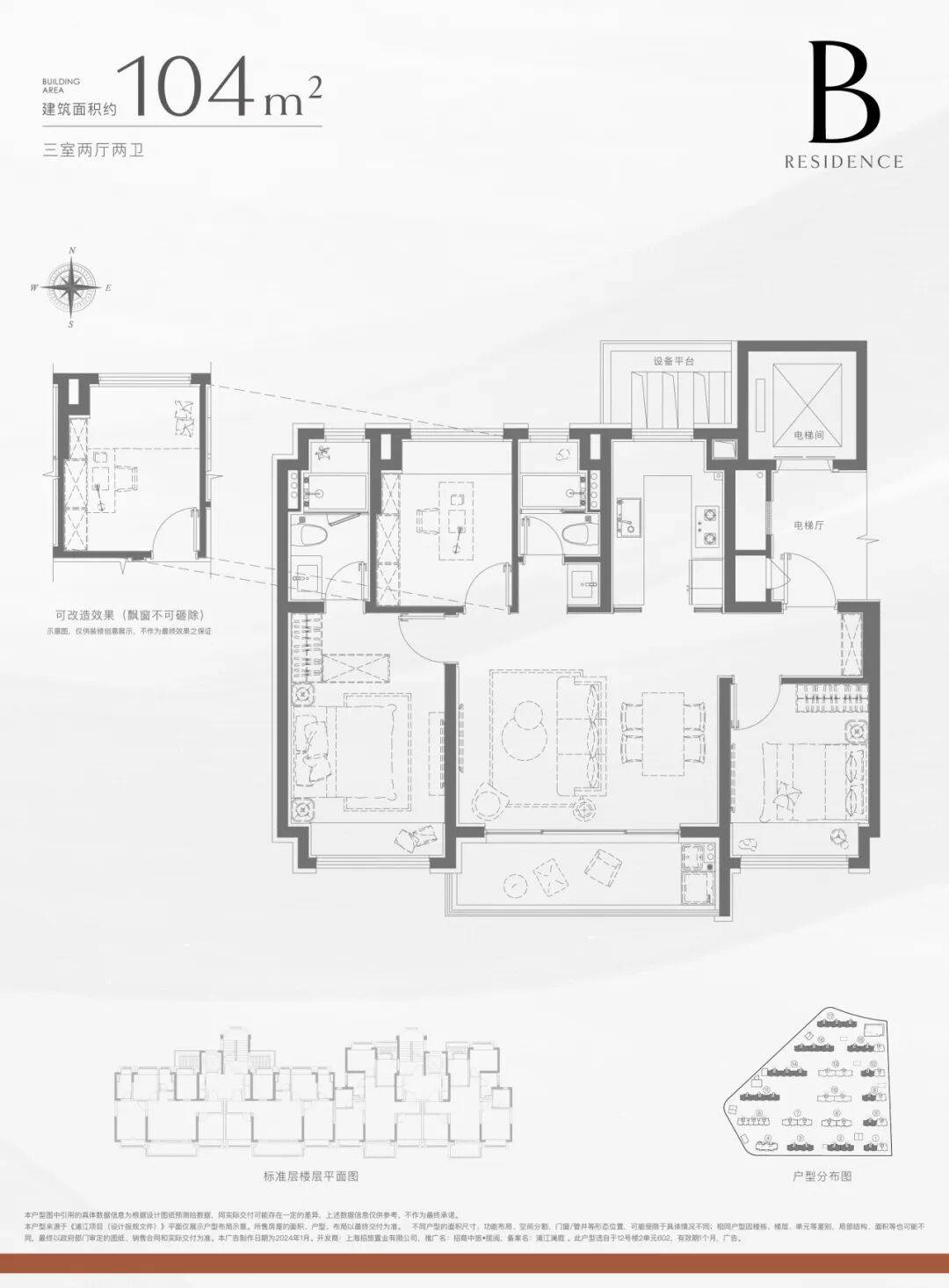 104㎡的户型,采用了大横厅 +270°转角窗设计,南向阔景阳台面宽约5.3米,这样的尺度,在100平出头的面积段极其罕见。另一个南向客卧不管是当成老人房还是客房,都与另外两房做了物理分割,保证了最大程度的舒适度和私密性。