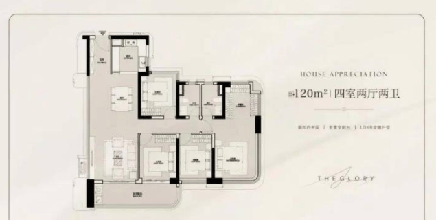 建面约170㎡的四房两厅三卫户型,同样为南地块板楼产品,使用率101%。该户型做到了五开间朝南,采光通风效果达到了极致。8米的横厅连接观景阳台,空间开阔度极高,适合举办家庭聚会或商务沙龙。餐厨一体化设计,适配大家庭的聚餐需求。主卧带全景飘窗,观景视野更佳,让每一天都在美景中醒来。而建面约210㎡的四房两厅三卫户型,则是项目的大户型改善款,使用率113%。独梯入户设计,彰显了身份的尊贵。客厅开间5.2米,搭配9米超长阳台,江景与园景双重视野,让人心旷神怡。双主套+双次卧的布局,充分满足了多人口家庭的居住需求,每个家庭成员都有独立的空间。仅南地块少量房源在售,稀缺性极高,是收藏级的豪宅产品。